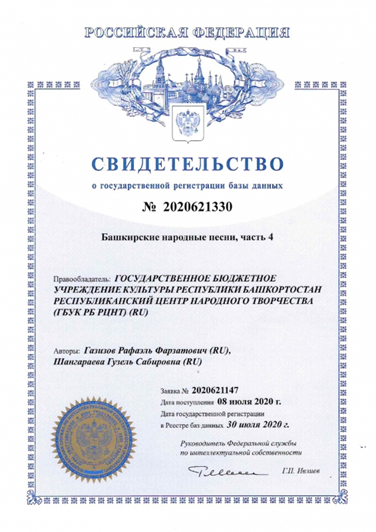 «Базы» представляют собой сведения, основанные на систематизации и паспортизации башкирских народных песен, включающие исторические данные, музыкальную нотацию, тексты песен. Уникальность базы данных заключается в том, что она содержит активные ссылки просмотра информации по каждой песне в сети Интернет, в том числе и для прослушивания аудиофайлов. Информация о регистрации базы данных размещена на сайте Научной электронной библиотеки elibrary.ru. Правообладатель: Государственное бюджетное учреждение культуры Республики Башкортостан Республиканский центр народного творчества Дата государственной регистрации в Реестре баз данных 30 июля 2020 года Авторы: Газизов Р.Ф., Шангараева Г.С.