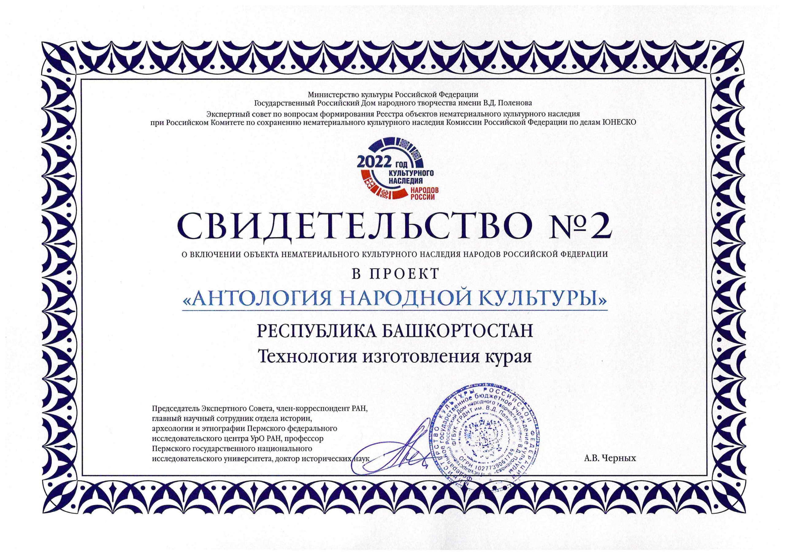 Свидетельство № 2 о включении объекта нематериального культурного наследия народов Российской Федерации в проект «Антология народной культуры». Республика Башкортостан. Технология изготовления курая