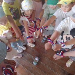 Символы праздника были розданы воспитанникам детского сада «Сказка» и жителям города. Вместе с ленточками рассказали об истории праздника, значении цветов российского флага.