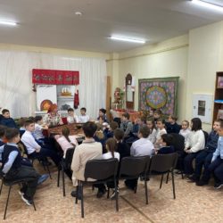Сегодня, руководитель народного ансамбля русской песни «Мироколица» Татьяна Вершинина пригласила к себе в гости учащихся 3-го класса школы № 1. Ребята окунулись в мир русского фольклора: размышляли над понятием » Народная мудрость», разобрали значение элементов народного костюма, открыли смысл старинных слов — лакомник, кокошник, гарусный поясок. В сопровождении народного инструмента спели распевки, весенние заклички. Узнали, как в старину по звучанию голоса в пространстве определяли приход весны. Традиционно в конце занятия в качестве подарка прослушали сказку «Скрипи липова нога». Образ русской зимушки — большухи, которая борется с приходом весны, воплотился в рассказе о масленичной неделе. Особый интерес вызвал вторник, «Заигрыш, в котором все внимание в народном гулянии отдавалось молодым парам, недавно поженившимся. Четверг — разгуляй заинтересовал кулачными боями — символом борьбы тепла и холода, весны и зимы. Ребята спели песню М.Исаковского «Катюша», которая завершила встречу с народной культурой. Расставались с желанием встретиться вновь.