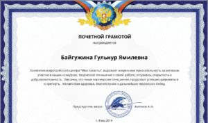 Руководитель Байгужина Гульнур Ямилевна награждена почетной грамотой за активное участие.