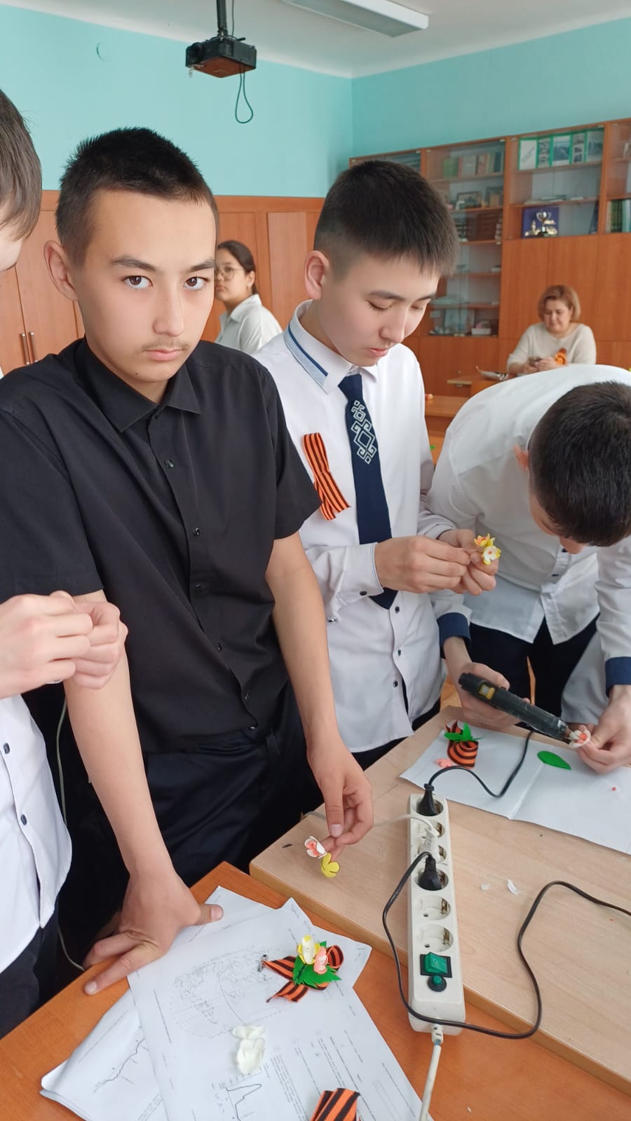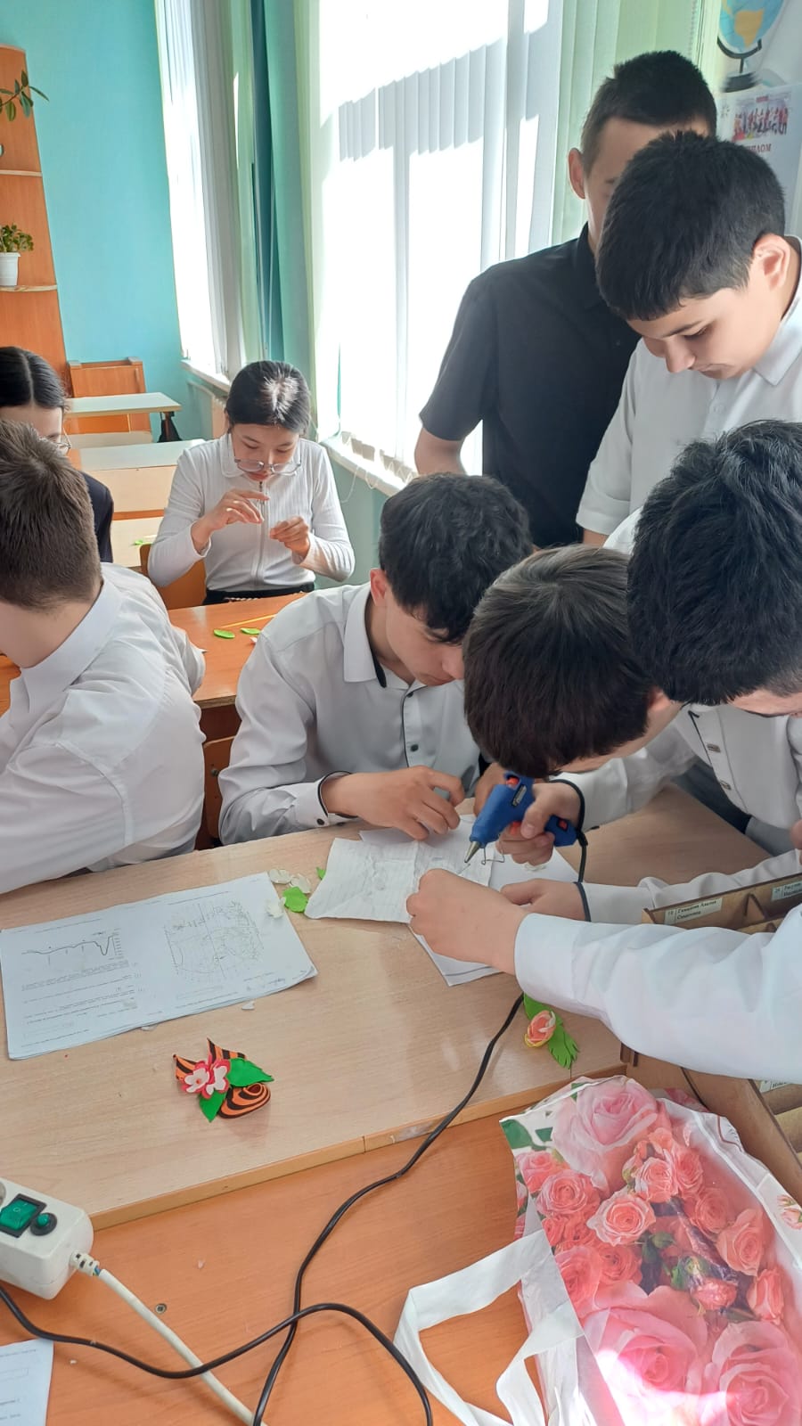Сегодня в МОБУ Лицей «Ирандык» для учеников 7 класса прошëл мастер-класс «Цветущий май» по изготовлению декоративной броши с использованием символа Дня Победы — Георгиевской ленты, чтобы сохранить память и гордость за Победу нашей страны в Великой Отечественной войне. Каждый ученик создавал свою брошь из георгиевской ленты и фоамирана, чтобы добавить оригинальности своим изделиям, вложив частичку своей души. Каждый смог проявить свою фантазию и индивидуальность при создании броши. Это мероприятие стало не только творческой площадкой, но и поводом для разговоров о патриотизме и уважении к героям. В завершение мастер-класса каждый рассказал о значении своей броши и о том, почему важно помнить подвиги предков. Мастер-класс оставил яркие впечатления у всех, вдохновляя детей на дальнейшие творческие успехи и сохранение исторической памяти.