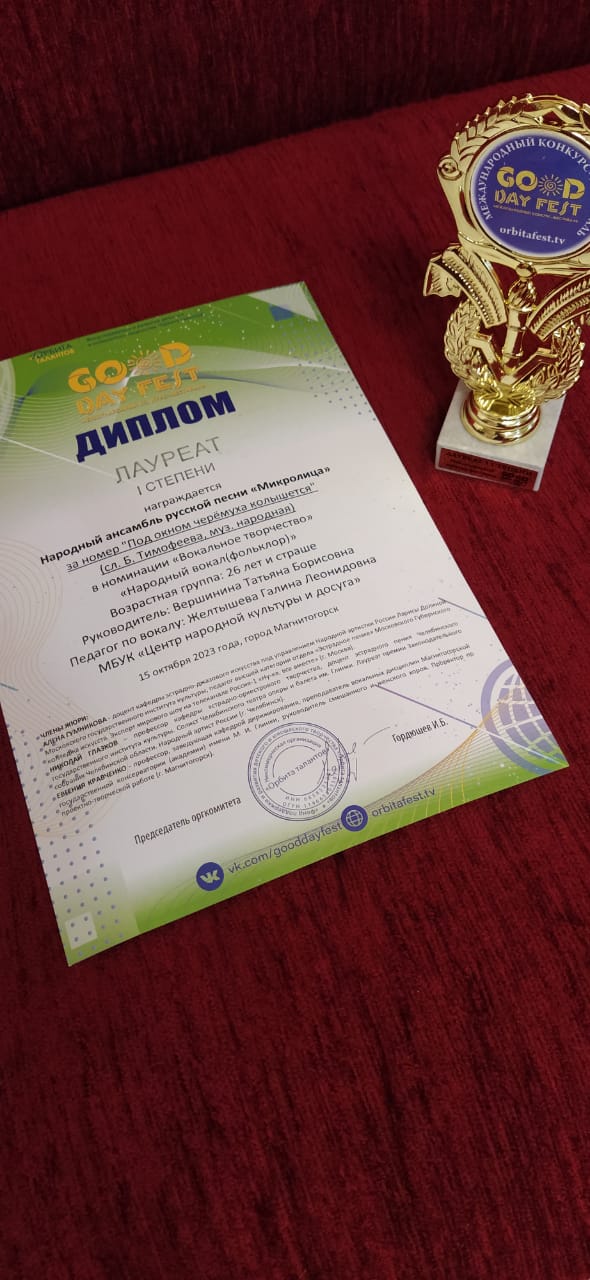 15 октября 2023 года в городе Магнитогорск в Доме Дружбы народов прошел Международный конкурс-фестиваль «Good Dаy Fest» . Народный ансамбль русской песни «Мироколица» под руководством Вершининой Татьяны Борисовны не упустили возможности испытать свои силы и не прогадали – коллектив занял призовое место! Они стали лауреатом I степени в номинации «Народный вокал (фольклор)». Исполнили песню «Под окном черемуха колышется» и строгое жюри по достоинству оценило талант вокалистов. И в результате наши артисты привезли в родной город не только заслуженные дипломы и награды, но и море опыта и впечатлений! По словам Татьяны Борисовны, они заворожили не только весь зал, но и компетентное жюри. Членами жюри были: