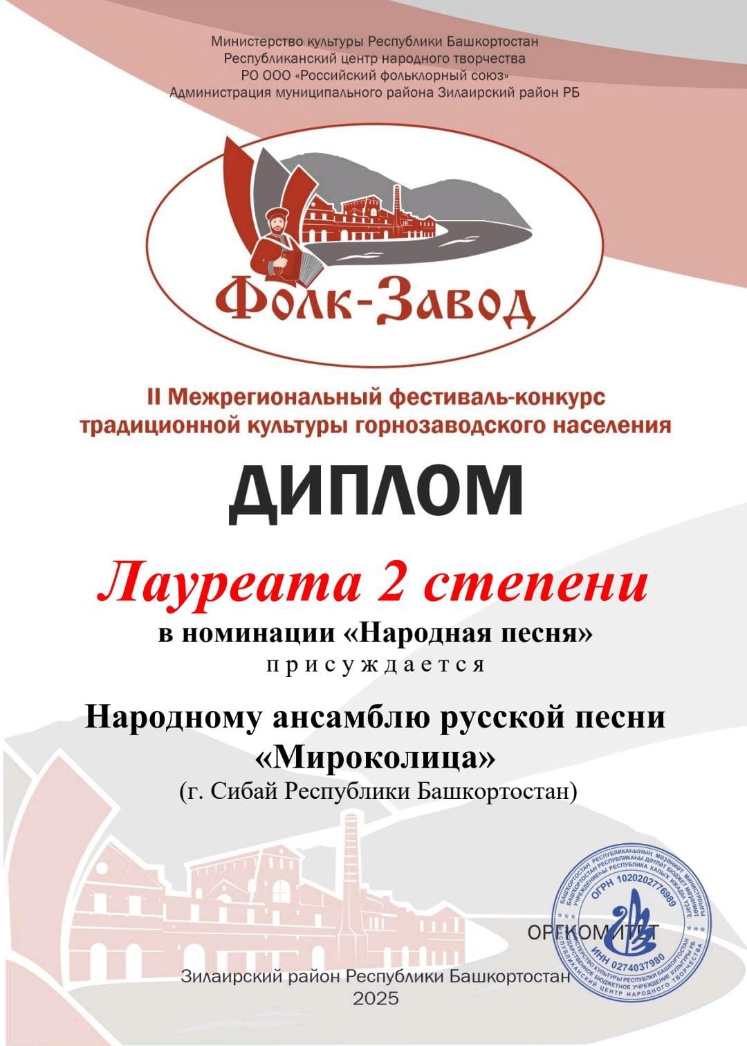 23 августа народный ансамбль русской песни «Мироколица» (руководитель Вершинина Т.Б.) принял участие во II Межрегиональный фестиваль — конкурсе традиционной культуры горнозаводского населения «ФолкЗавод». В этот день на площади районного дворца культуры отмечалось 95-летие Зилаирского района.