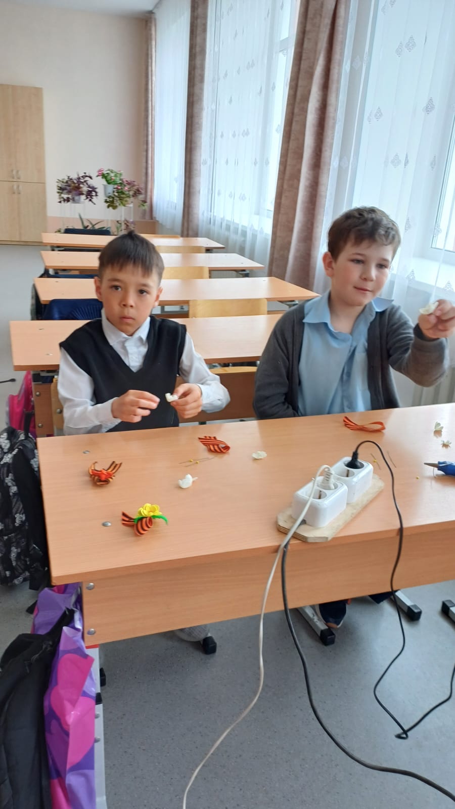 В результате, каждый ученик сделал себе красивый значок из георгиевской ленты. Прекрасное творение, сделанное своими руками, теперь можно носить на груди гордостью за себя и за Великую Победу.