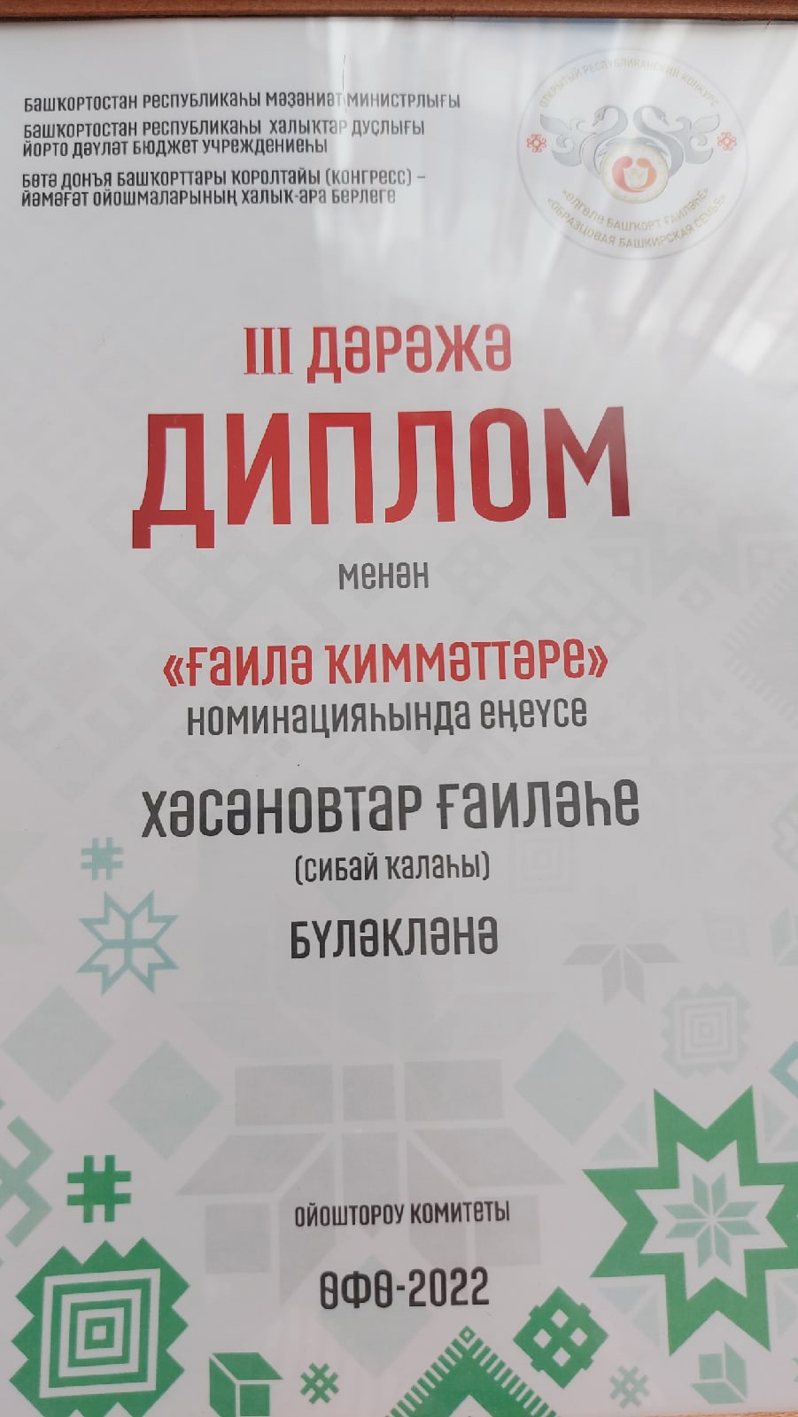 27 февраль дә Өфөлә «Өлгөлө башҡорт ғаиләһе – 2022» асыҡ республика конкурсының еңеүселәре билдәләнде. Хәсәновтар ғаиләһе Сибай ҡалаһы исеменән бәйгелә ярышып «Ғаилә ҡиммәттәре» номинацияһында 3 яуланы.