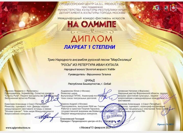 Поздравляем с победой на Международном конкурсе-фестивале искусств «На Олимпе» солистов народного ансамбля русской песни «Мироколица» Лидию Давлетшину, Наталью Букину и Татьяну Вершинину. Трио завоевало в онлайн конкурсе Диплом лауреата I степени в номинации «Народный вокал. Золотой возраст»!!! Трио представило народную песню «Росы» из репертуара фольклорной группы «Ивана Купала». Выступление завоевало высокую оценку достойного жюри международного конкурса. Поздравляем ансамбль очередной победой и желаем новых побед!