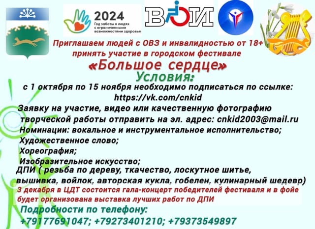 💥МБУК «Центр народной культуры и досуга» пригашает принять участие людей с ограниченными возможностями здоровья в городском фестивале под названием «Большое сердце» , в рамках Года заботы о людях с ОВЗ в РБ.
